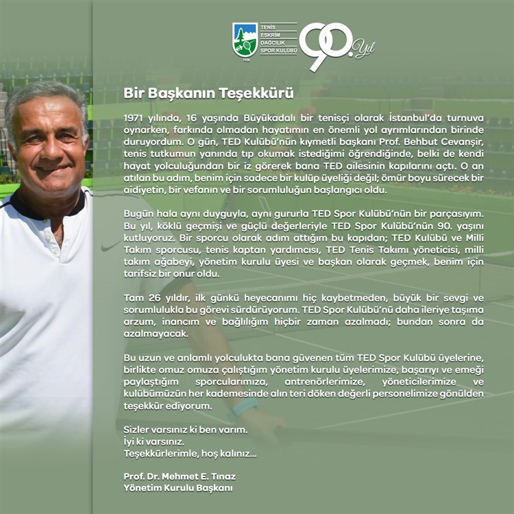 Bu uzun ve anlamlı yolculukta bana güvenen tüm TED Spor Kulübü üyelerine, birlikte omuz omuza çalıştığım yönetim kurulu üyelerimize, başarıyı ve emeği paylaştığım sporcularımıza, antrenörlerimize, yöneticilerimize ve kulübümüzün her kademesinde alın teri döken değerli personelimize gönülden teşekkür ediyorum.